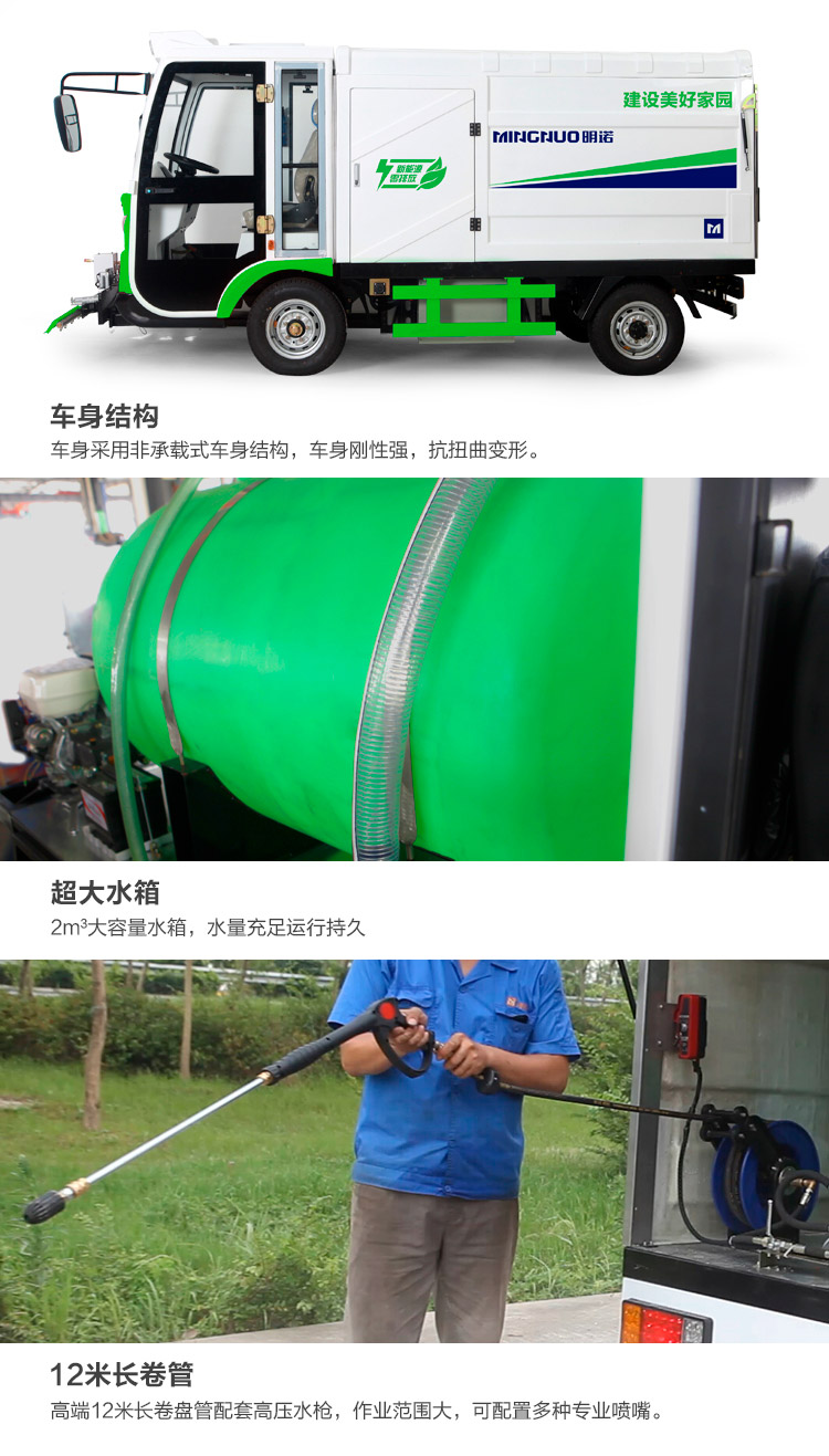 四轮路面养护MN-H51配备喷水枪,主要用于清除城市中“牛皮癣”、小广告、道板、护栏、路崖的死角等部位和路边摊地面油污,也可用于消毒和喷洒农药。